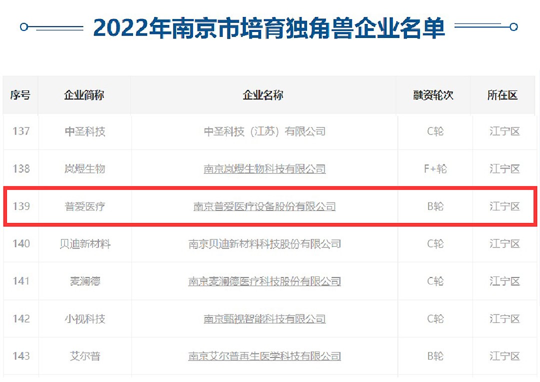繼2021年獲此殊榮,普愛(ài)醫(yī)療再次被評(píng)為“南京市培育獨(dú)角獸企業(yè)”,彰顯了普愛(ài)醫(yī)療日益壯大的企業(yè)實(shí)力和業(yè)界對(duì)公司科研及發(fā)展成果的充分肯定。